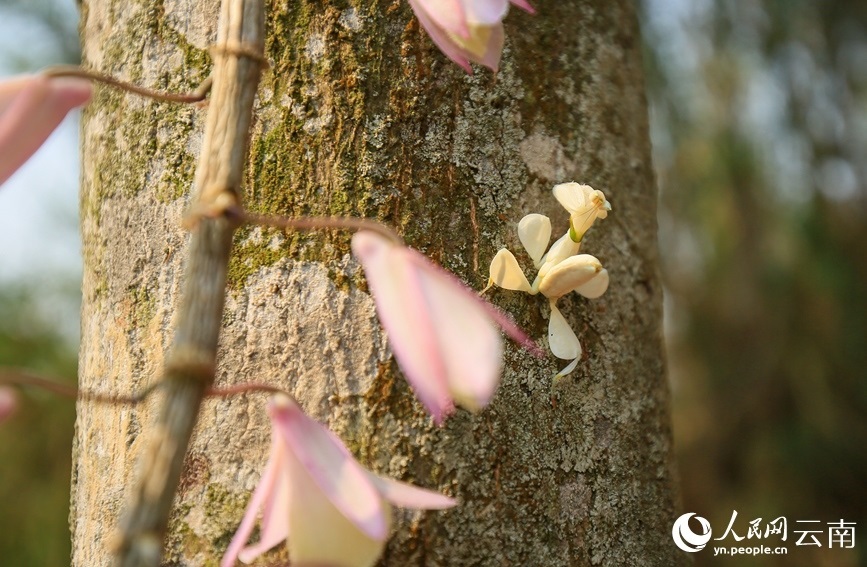 周會(huì)蘭介紹,4月12日早上,她吃過早飯后來到自家附近的山上采摘可食用的白花,在一條箐溝旁的樹林陡坡處,她采摘了一些白花后,轉(zhuǎn)身開始撿拾落在草叢中的白花。“突然,一朵白色的花引起了我的注意,當(dāng)我伸手去撿時(shí),這朵花竟然自己挪了個(gè)位置。”周會(huì)蘭說,當(dāng)時(shí)覺得很奇怪,花還會(huì)自己動(dòng),慢慢才發(fā)現(xiàn)是一只蟲子。