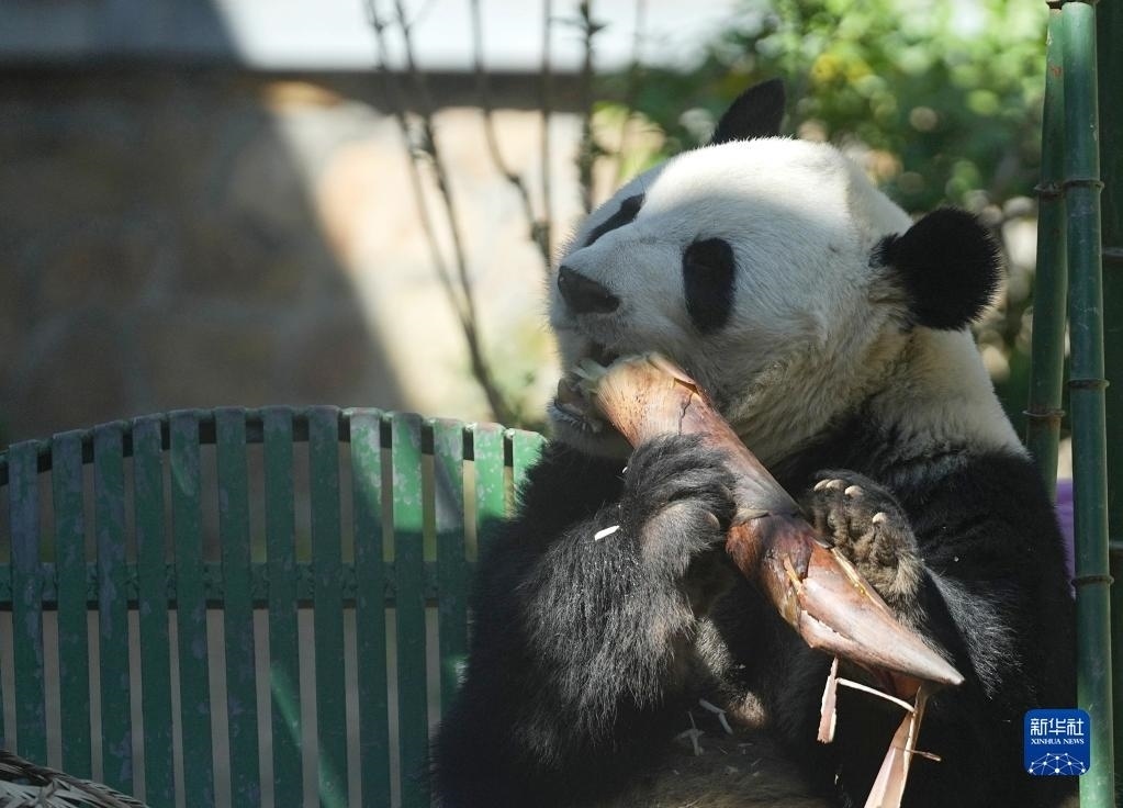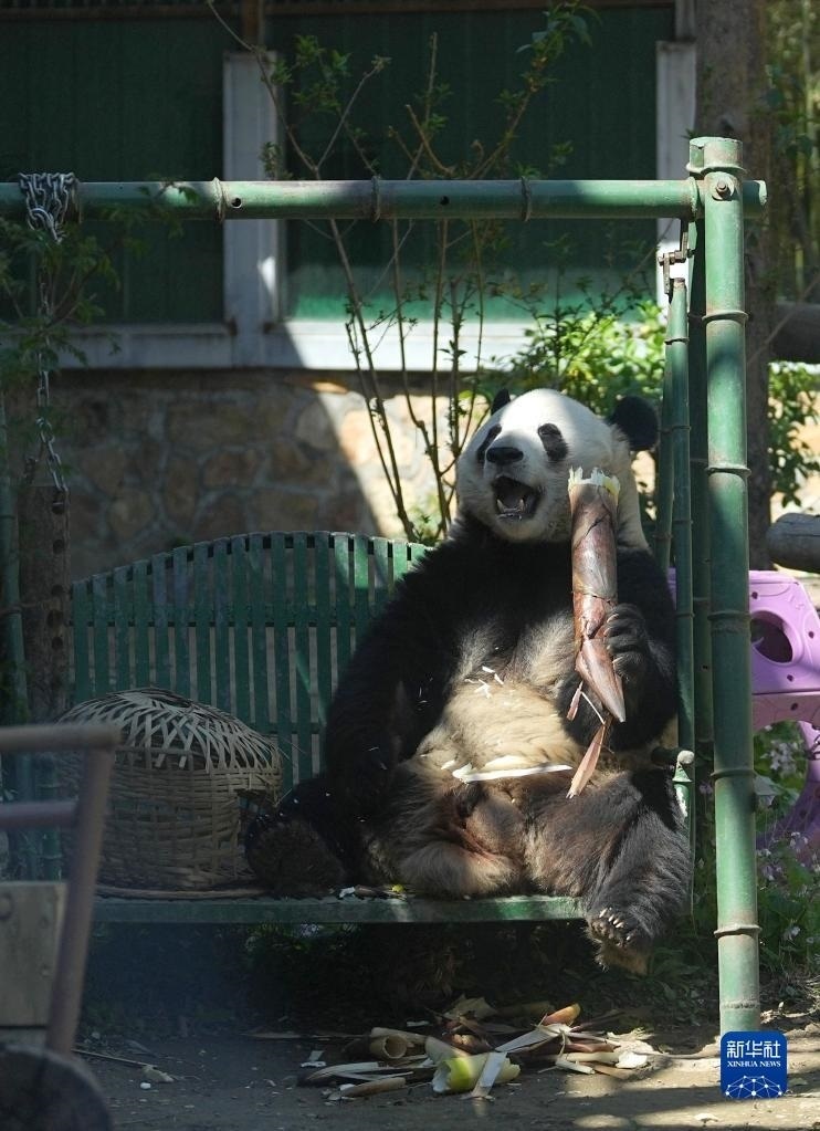 4月30日,在北京動物園大熊貓館,大熊貓“萌蘭”在吃竹筍。