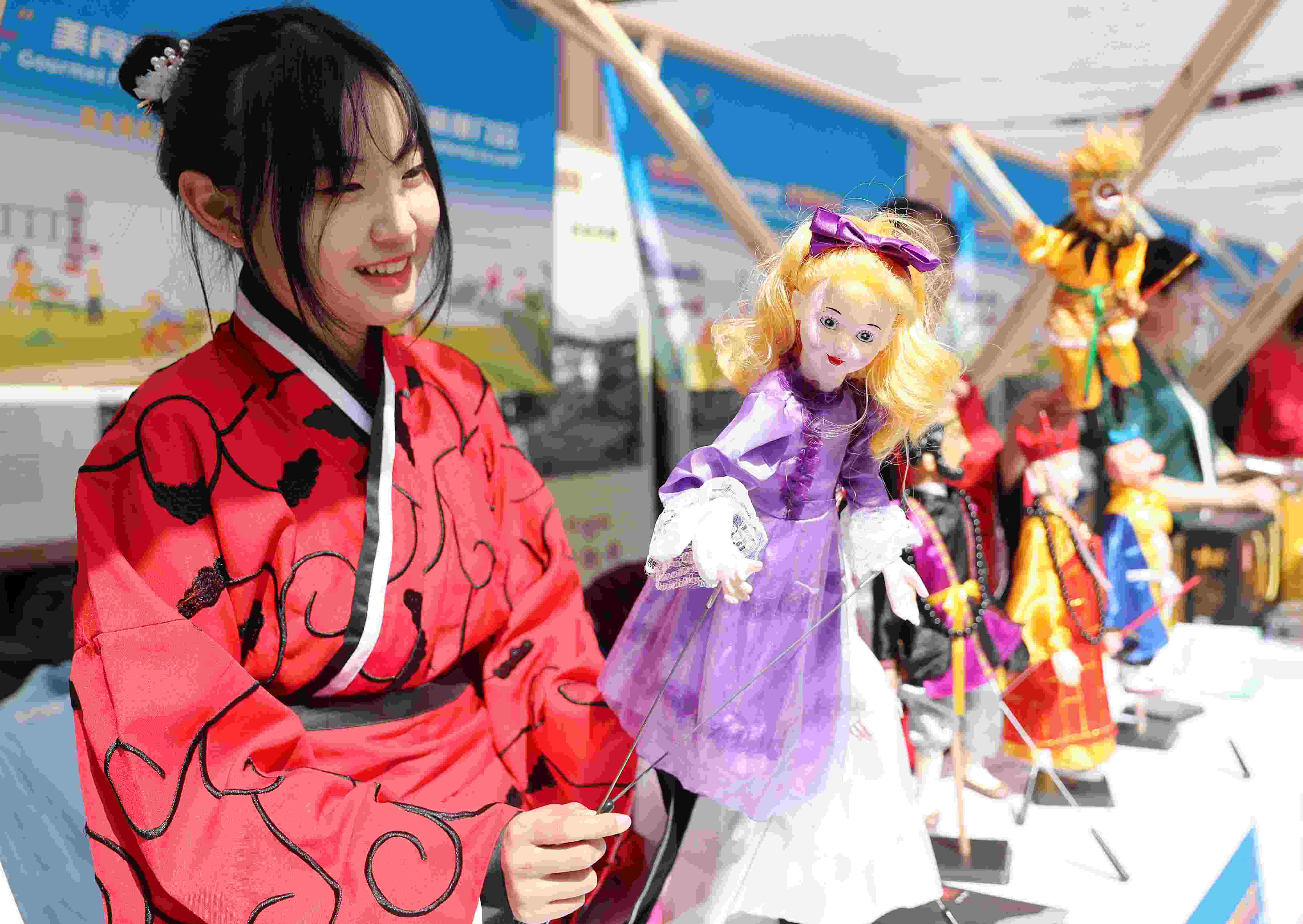 4月30日,山東萊西木偶藝術(shù)團的演員在給游人們展示木偶戲的表演技巧。 張進剛 攝