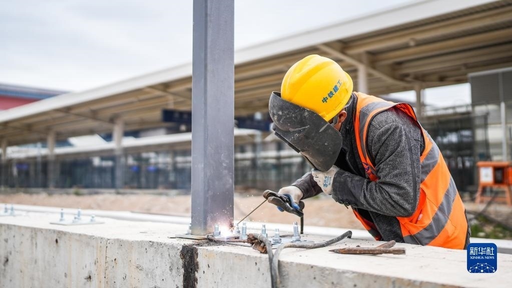 5月1日,中鐵建工集團工人在貴州貴安新區(qū)貴安站擴建項目工地施工。