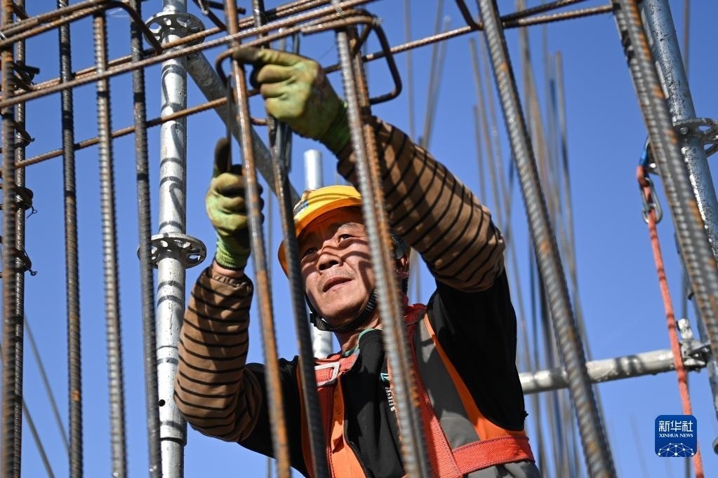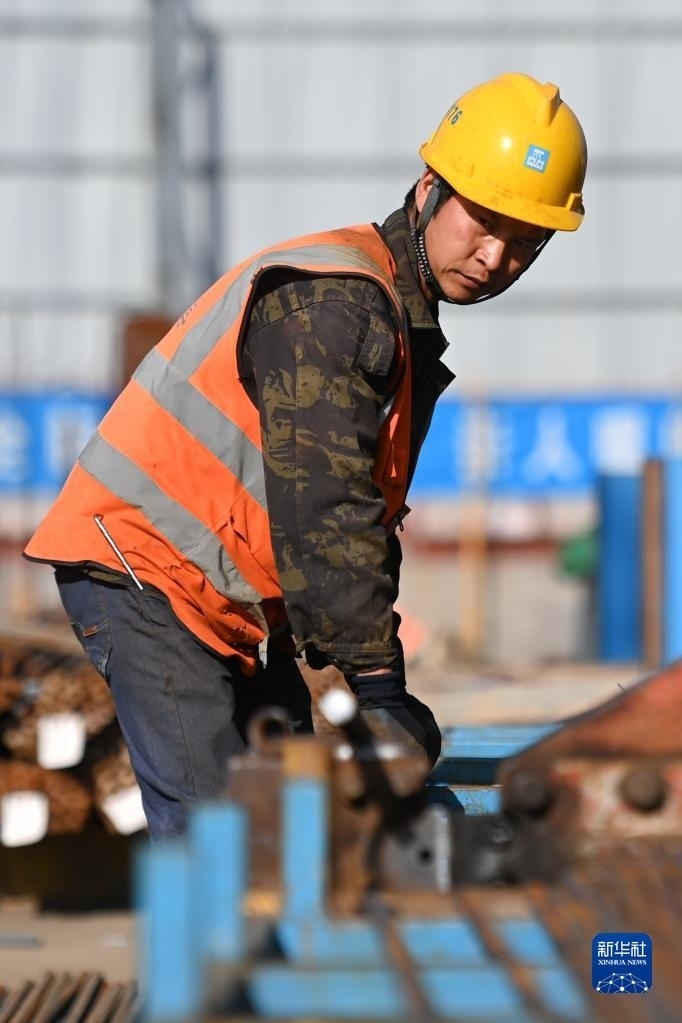 5月1日,工人在中建二局陜西分公司高鐵新城項目工地施工。