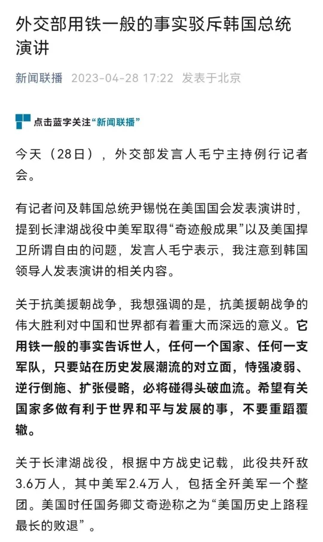 根據(jù)外媒報(bào)道,韓國總統(tǒng)4月27日在美國國會(huì)發(fā)表演講稱,美國海軍陸戰(zhàn)隊(duì)第一師在長津湖戰(zhàn)役中取得了所謂的“奇跡般成果”。