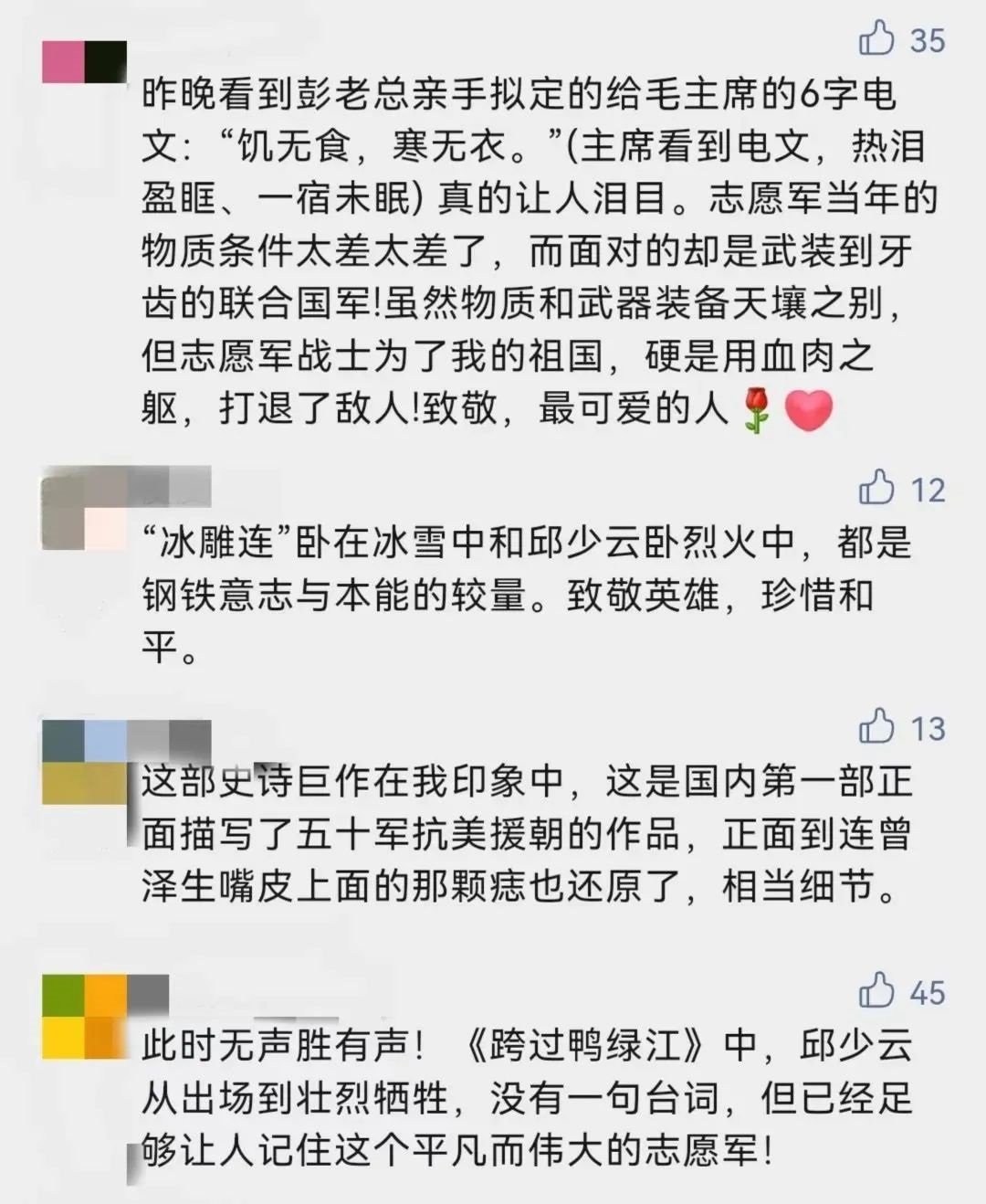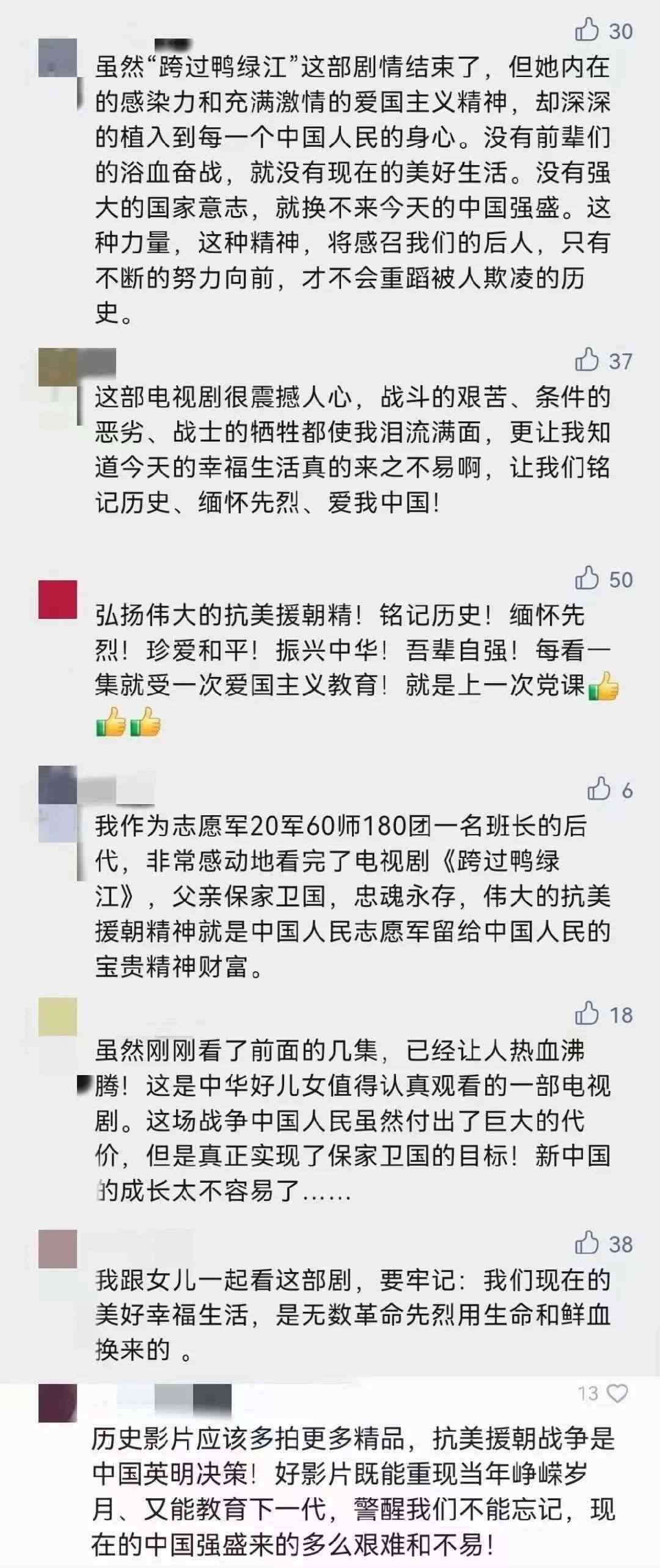 “抗美援朝絕對是值得紀(jì)念和謳歌的奇跡!這部電視劇是一部愛國主義教育的活教材!”這是網(wǎng)友對這部劇的評價(jià)。