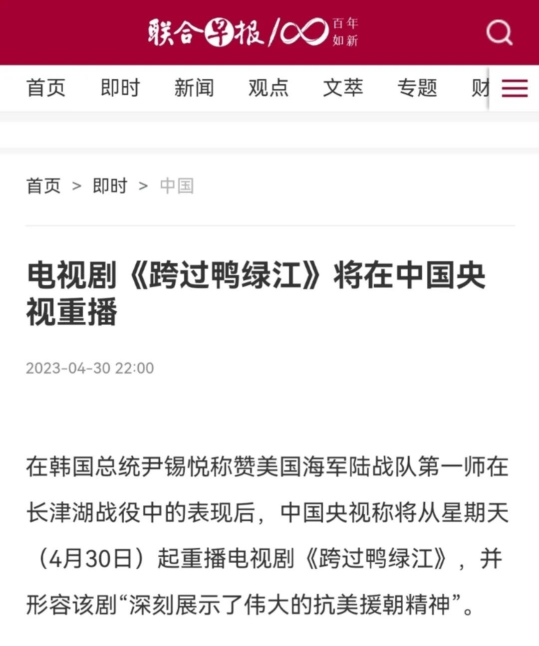 新加坡《聯(lián)合早報(bào)》更在4月30日晚10點(diǎn)準(zhǔn)時(shí)發(fā)布文章《電視劇<跨過鴨綠江>將在中國央視重播》,開篇明確重點(diǎn):在韓國總統(tǒng)稱贊美國海軍陸戰(zhàn)隊(duì)第一師在長津湖戰(zhàn)役中的表現(xiàn)后,中國央視稱將從星期天(4月30日)起重播電視劇《跨過鴨綠江》。