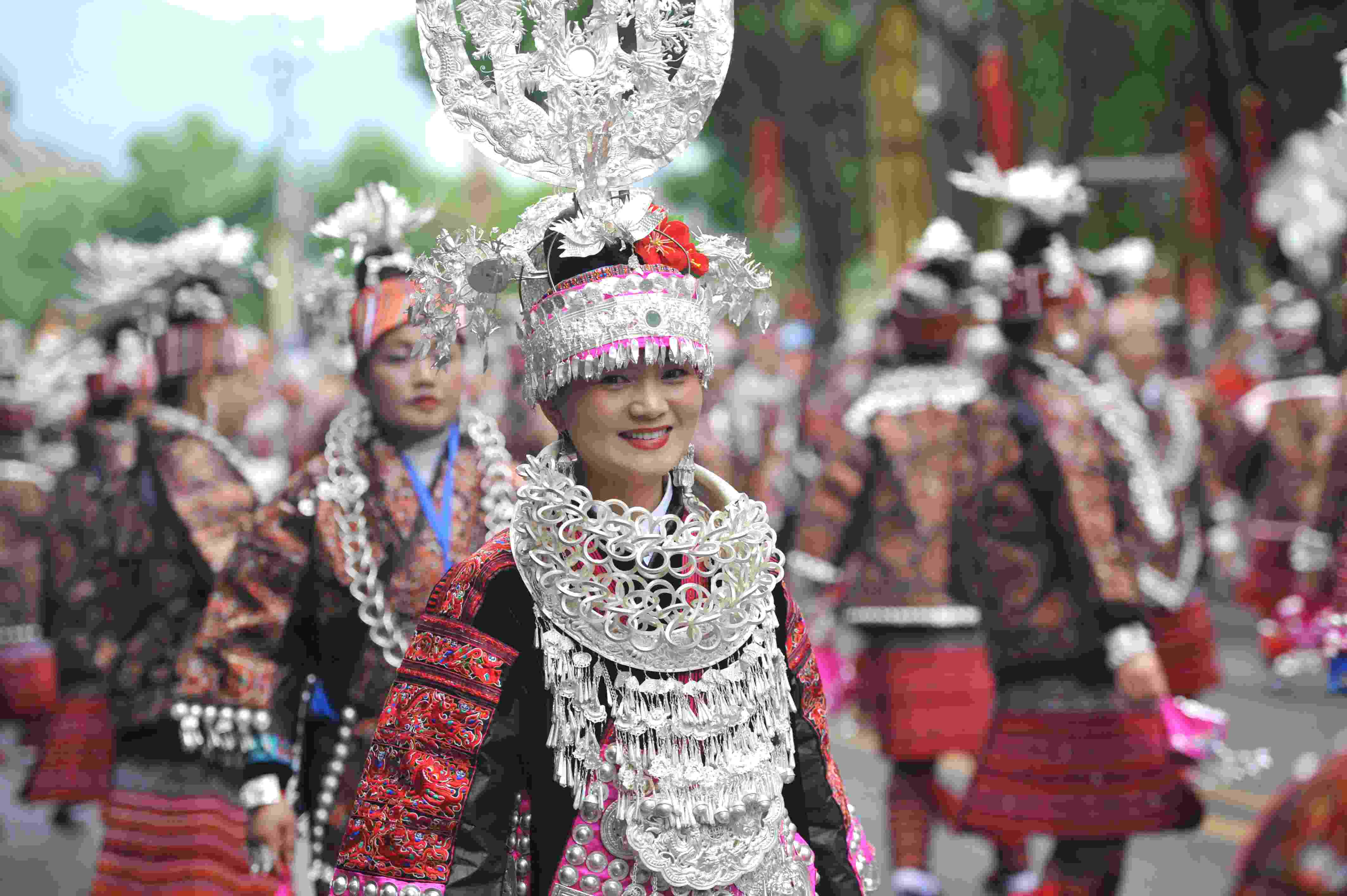 2023年5月2日,苗族同胞在參加“中國臺(tái)江2023苗族姊妹節(jié)”盛裝游演。