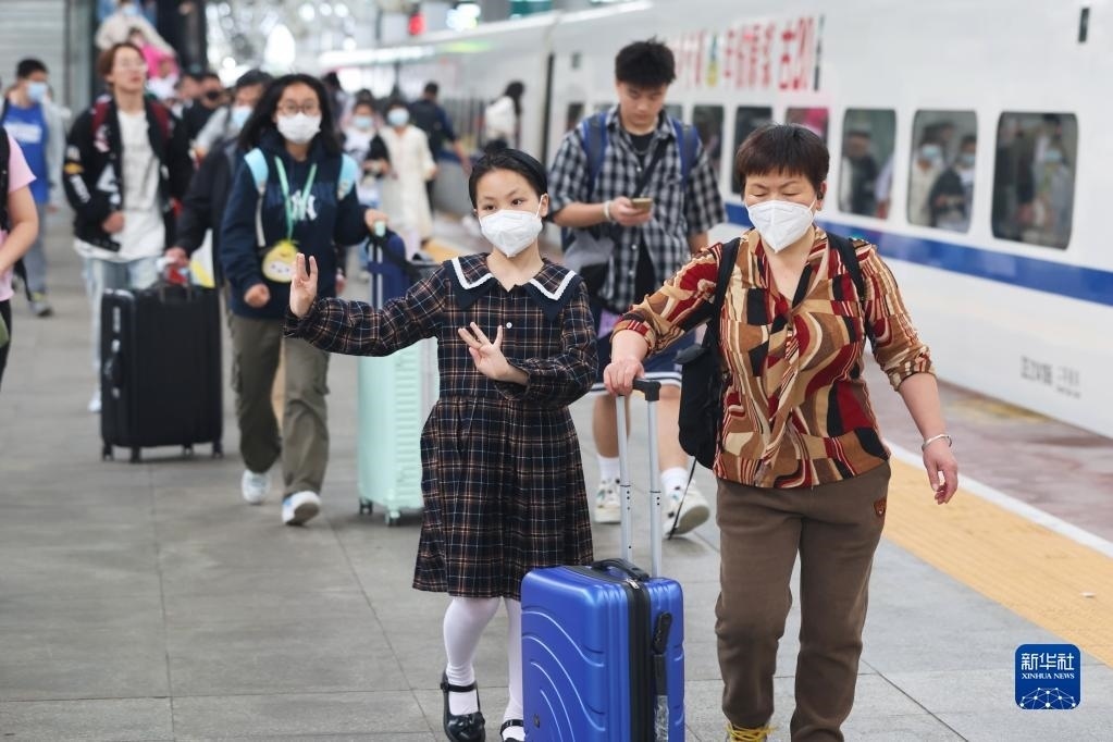 5月3日,剛下車的旅客在南京火車站準備出站。
