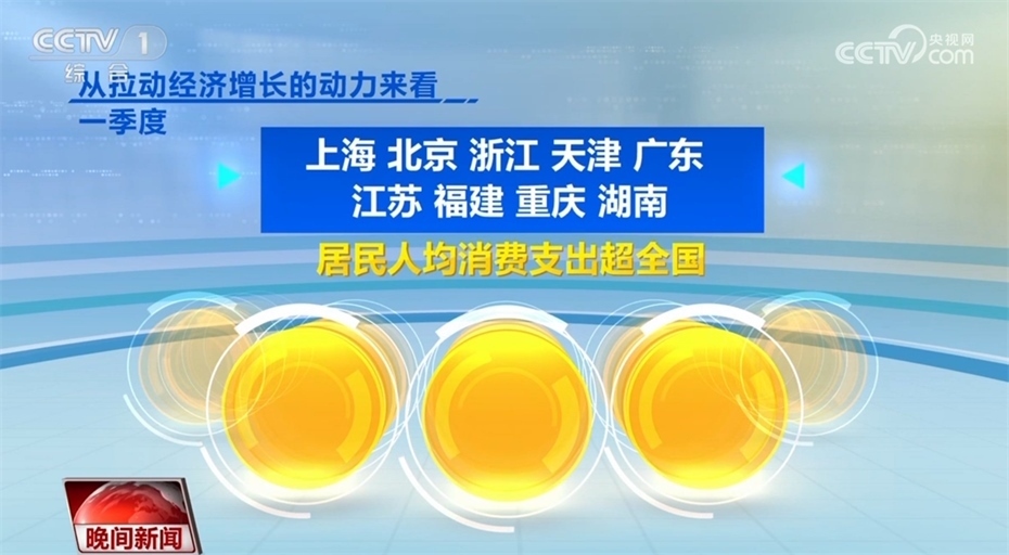 此外,各地經(jīng)濟發(fā)展也呈現(xiàn)回升向好態(tài)勢。目前,全國31個省(區(qū)、市),已經(jīng)全部公布一季度的經(jīng)濟運行數(shù)據(jù)。從GDP增速來看,31個省(區(qū)、市)中有23個省份跑贏全國一季度GDP平均增速4.5%,從地區(qū)GDP總量看,有12個省份超1萬億,廣東超過了3萬億。從拉動經(jīng)濟增長的動力來看,一季度,上海、北京、浙江、天津、廣東、江蘇、福建、重慶、湖南9省份,居民人均消費支出超全國。