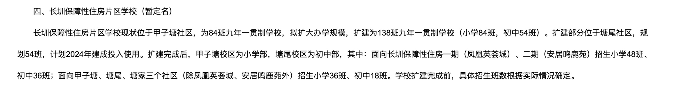 根據(jù)最新的學(xué)區(qū)劃分方案,長圳保障性住房片區(qū)學(xué)?,F(xiàn)狀位于甲子塘社區(qū),為84班九年一貫制學(xué)校,擬擴(kuò)大辦學(xué)規(guī)模,擴(kuò)建為138班九年一貫制學(xué)校(小學(xué)84班,初中54班)。擴(kuò)建部分位于塘尾社區(qū),規(guī)劃54班,計(jì)劃2024年建成投入使用。擴(kuò)建完成后,甲子塘校區(qū)為小學(xué)部,塘尾校區(qū)為初中部,其中:面向長圳保障性住房一期(鳳凰英薈城)、二期(安居鳴鹿苑)招生小學(xué)48班、初中36班;面向甲子塘、塘尾、塘家三個(gè)社區(qū)(除鳳凰英薈城、安居鳴鹿苑外)招生小學(xué)36班、初中18班。
