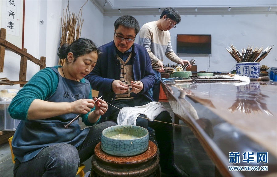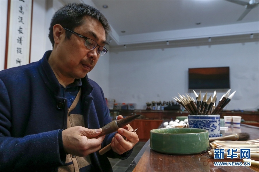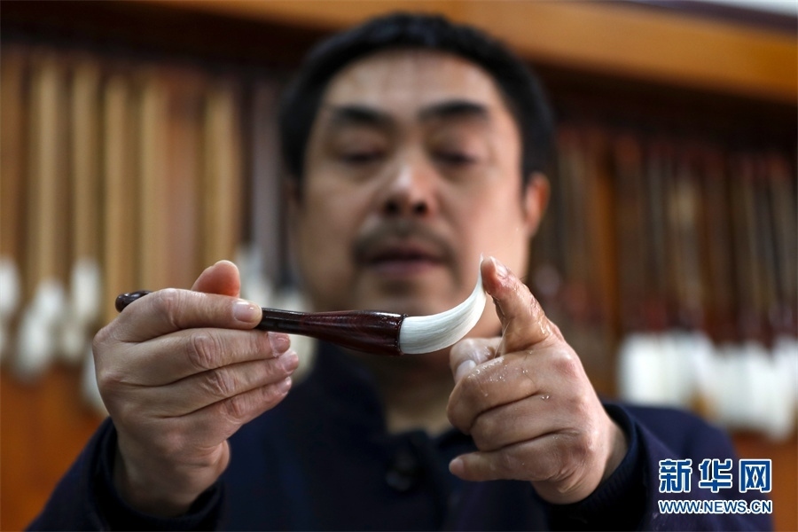 一支好的徽筆,不僅要保留傳統(tǒng)工藝,且要在原基礎(chǔ)上不斷創(chuàng)新、改良。楊文尤其重視書(shū)畫(huà)家對(duì)筆的使用反饋:“因?yàn)樗麄儗?duì)用筆最挑剔,而且現(xiàn)代書(shū)畫(huà)家創(chuàng)作方式和作品不斷創(chuàng)新,對(duì)毛筆也有新的要求,他們提出的要求我總是盡力去滿足,也使得制筆技藝進(jìn)一步得到了提高?!? 新華網(wǎng)發(fā)(施亞磊 攝)
