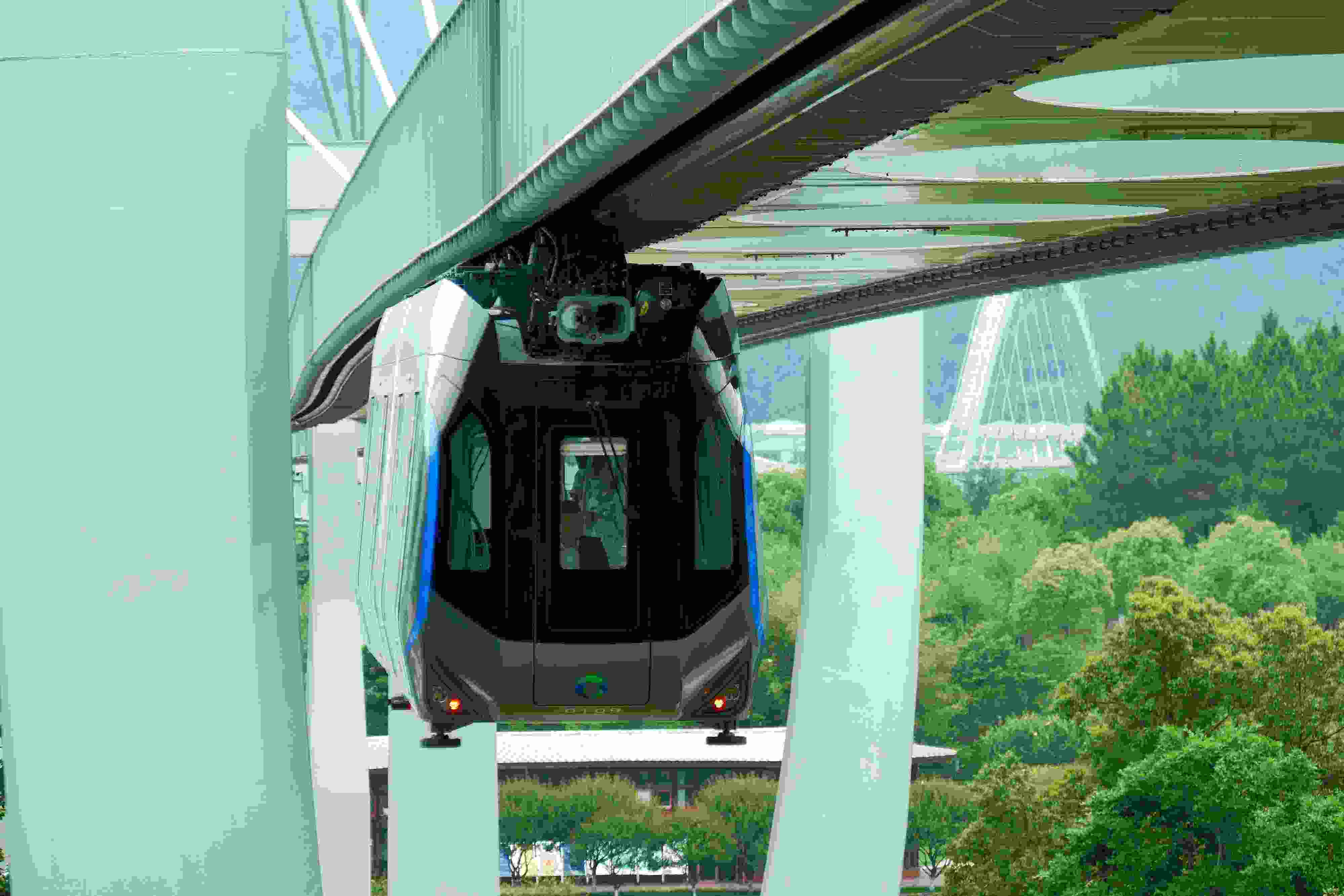 2023年5月11日,武漢,光谷空軌旅游線項(xiàng)目“光谷光子號(hào)”空中軌道列車在東湖高新區(qū)試跑。武漢光谷空軌旅游線項(xiàng)目位于武漢市東湖高新區(qū)光谷中央生態(tài)大走廊內(nèi),是生態(tài)大走廊旅游配套基礎(chǔ)設(shè)施之一。其規(guī)劃總長(zhǎng)26.7公里,先行建設(shè)的一期工程長(zhǎng)約10.5公里,設(shè)車站6座。 視覺中國(guó)