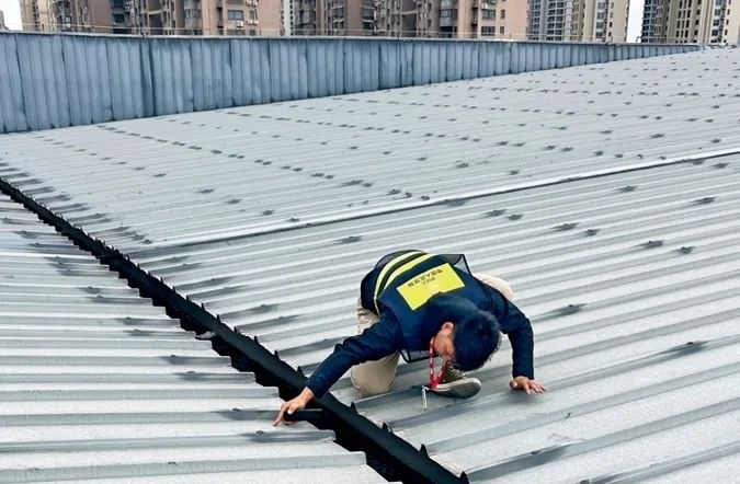 ▲“梅花”臺風將至,2022年9月14日16時,人保財險浙江溫州永嘉支公司青年員工趕在臺風前走訪重點企業(yè)開展防災(zāi)檢查。他不懼危險,爬上客戶廠房棚頂查看密封情況,只為確保廠房安全。