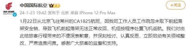 因工作人員疏忽導(dǎo)致飛機(jī)前起落架無法正常收回,國航:嚴(yán)肅追責(zé)問責(zé) @中國國際航空 微博發(fā)文,1月22日從北京飛往常州的CA1......