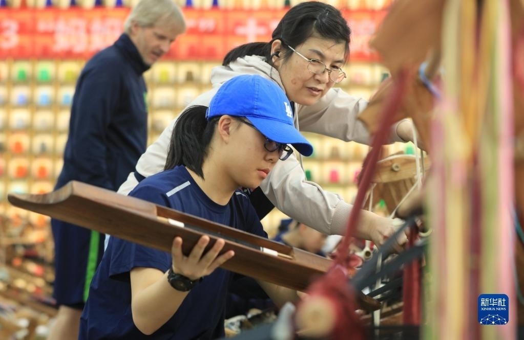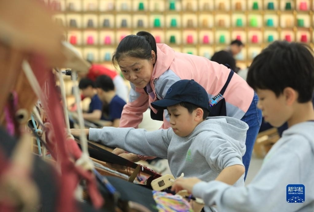 5月12日,來自上海包玉剛實(shí)驗(yàn)學(xué)校的學(xué)生在張家界市武陵源區(qū)乖幺妹土家族織錦基地學(xué)習(xí)體驗(yàn)土家族織錦非遺技藝。