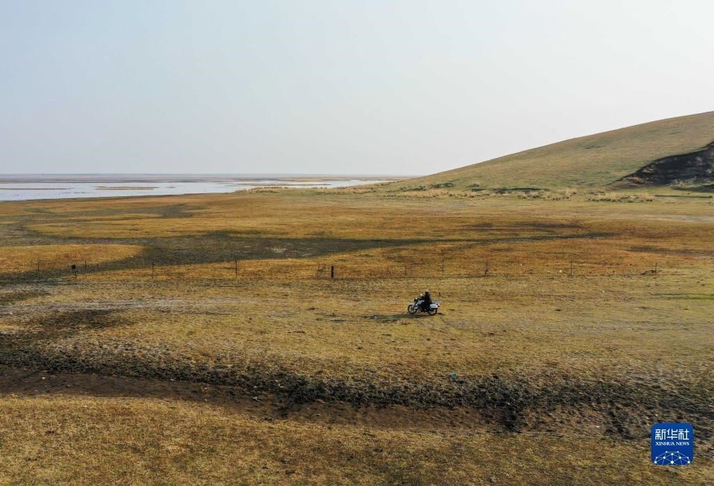 5月10日,徐沃德樂(lè)胡騎著摩托在管護(hù)站附近巡護(hù)(無(wú)人機(jī)照片)。