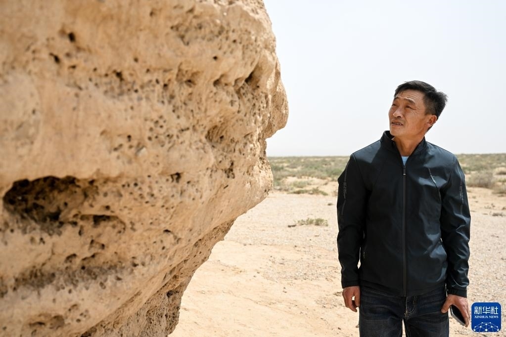 5月13日,駝峰(長城)文物保護(hù)隊員許繼龍在巡查阿拉善左旗一處石圈遺址。