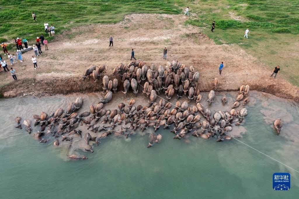 每年4-10月,在四川省南充市蓬安縣相如鎮(zhèn)油房溝村嘉陵江段,成群結隊的水牛在船只的護送引導下,清晨從岸邊結隊游上江心島啃食青草,黃昏又下水回游上岸歸欄,成為當地一道獨特的景觀,吸引不少游客前來觀看。