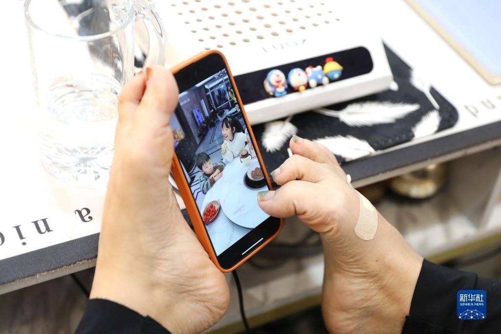 5月11日,韓丹翻看著手機(jī)里兩個孩子的視頻。