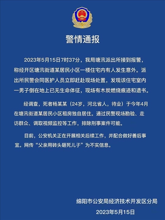 ·網(wǎng)傳“父親用磚頭砸死兒子”?綿陽警方通報:排除刑案可能,現(xiàn)場發(fā)現(xiàn)木炭燃燒痕跡和遺書。