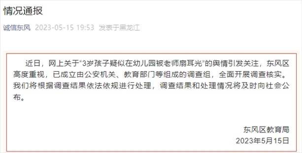 ·網(wǎng)傳“3歲孩子疑被幼師扇耳光”,官方通報:已成立調(diào)查組全面調(diào)查核實(shí)。