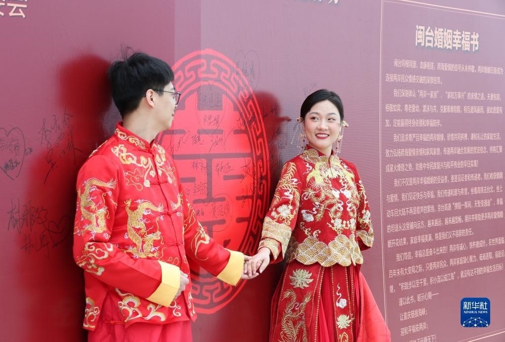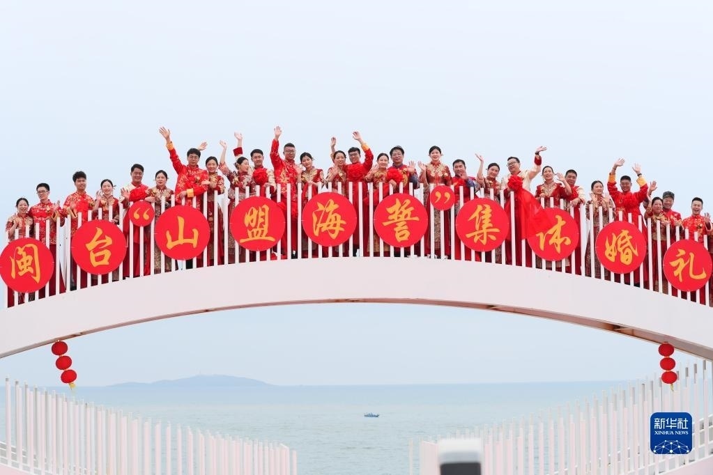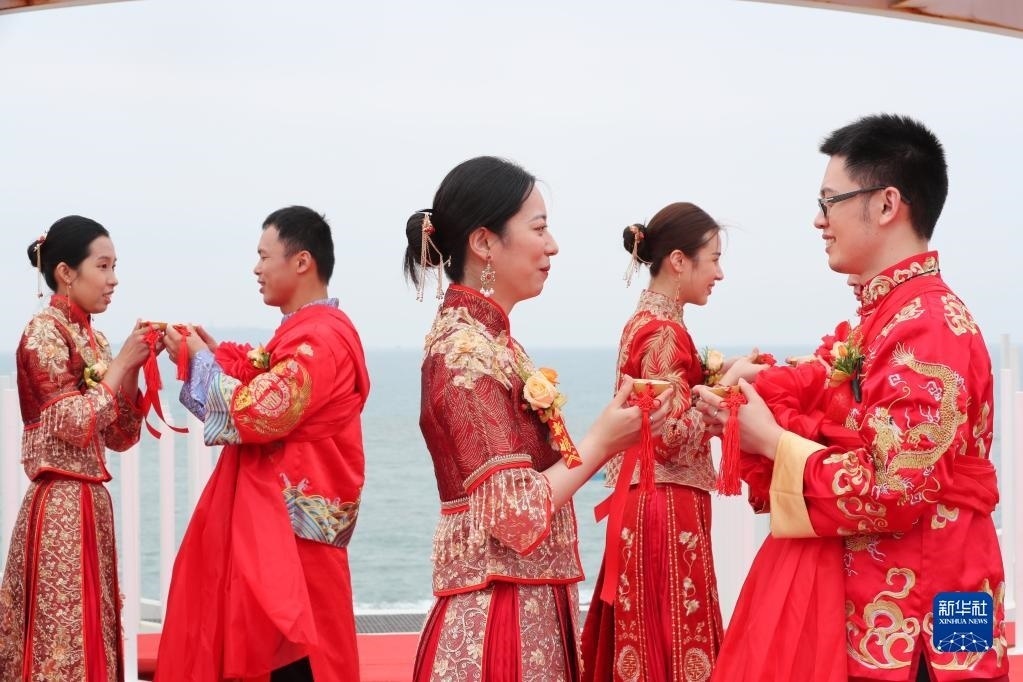 當(dāng)日,一場(chǎng)以“愛情恒久遠(yuǎn)、幸福長(zhǎng)相伴”為主題的閩臺(tái)“山盟海誓”集體婚禮暨2023年閩臺(tái)婚姻家庭交流活動(dòng)在福建省福州市平潭縣舉辦。21對(duì)閩臺(tái)新人身穿紅色中式婚服,手牽紅繡球,行跨火盆、踩瓦片、扎繡球和“合茶”、“合巹”、“海誓”等閩臺(tái)傳統(tǒng)結(jié)婚禮儀,結(jié)下跨越海峽的姻緣。