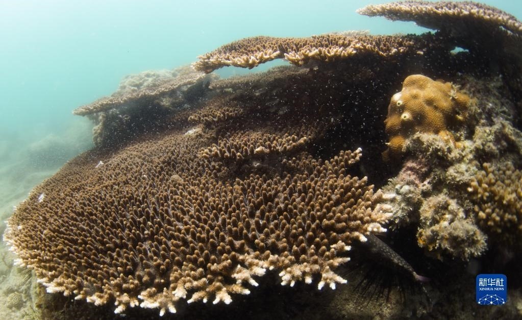 這是在蜈支洲島海域海洋牧場(chǎng)拍攝的珊瑚和魚群(2021年5月21日攝)。
