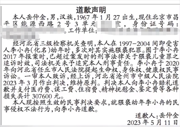 ·男子猥褻幼女因超追訴時效免于刑責,民事訴訟敗訴后登報向受害人致歉。