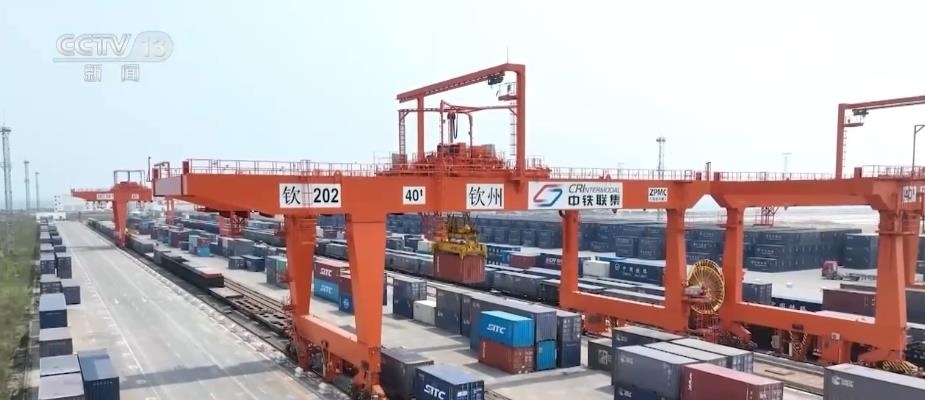 在西部陸海新通道關(guān)鍵節(jié)點的欽州港東站,鐵海聯(lián)運貨物上下列車、進出港口24小時不停歇,每天最多到發(fā)的鐵海聯(lián)運班列有21列。截至目前,西部陸海新通道鐵海聯(lián)運班列已輻射我國17省份、60市、115個車站,通達全球119個國家和地區(qū)的393個港口。