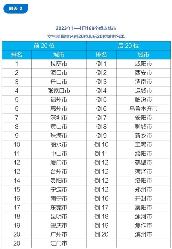 1—4月,168個重點(diǎn)城市中,拉薩、??诤椭凵降瘸鞘锌諝赓|(zhì)量相對較好(從第1名至并列第20名);咸陽、西安和渭南等城市空氣質(zhì)量相對較差(從倒數(shù)第1名至倒數(shù)第20名)。