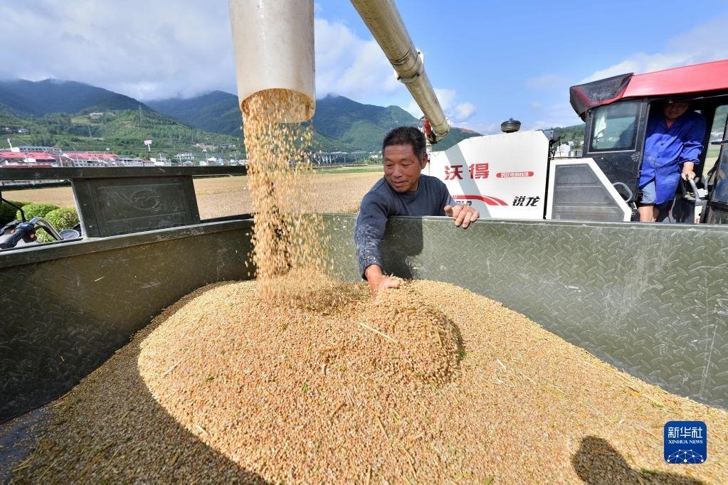 5月24日,收割機在山東省棗莊市山亭區(qū)鳧城鎮(zhèn)文王峪村田間收割小麥。