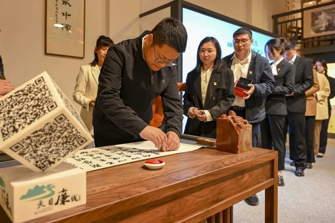杭州市臨安區(qū)深入挖掘印信文化中的廉潔元素,開展一諾“清”心的“蓋廉印”廉政教育活動(dòng),組織轄區(qū)年輕干部刻印一枚署有自己名字的“專屬”印章,許下“履職第一諾”,以滿滿的儀式感厚植廉潔理念。圖為臨安區(qū)昌化鎮(zhèn)年輕干部珍重蓋上自己的“清廉印”,許下“廉潔諾”。任曉東 攝