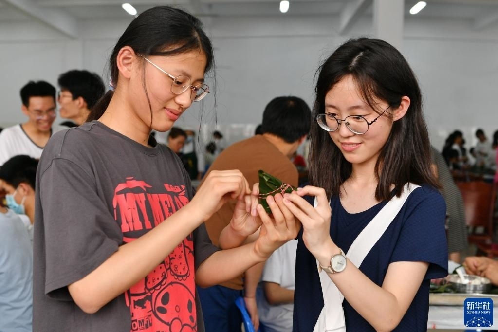 5月28日,在江蘇省常州市北郊高級(jí)中學(xué),高三學(xué)生在包粽子。