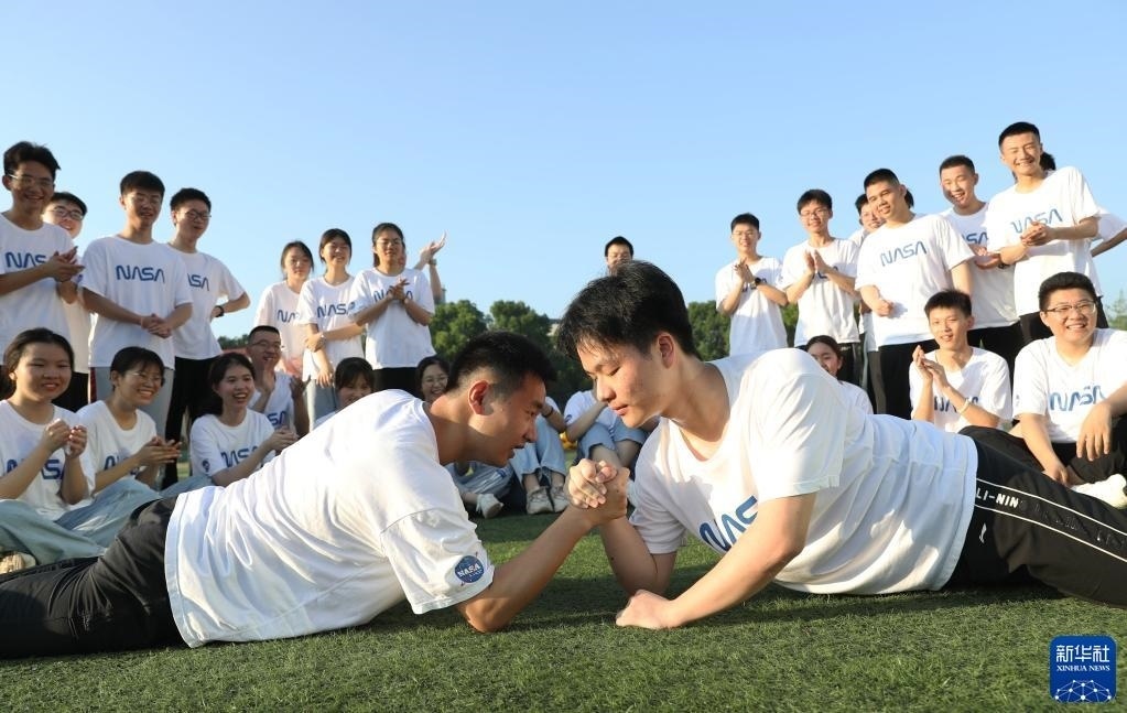5月25日,在湖南省永州市道縣道州玉潭(東陽(yáng))學(xué)校,高三學(xué)生在操場(chǎng)上做減壓趣味活動(dòng)。