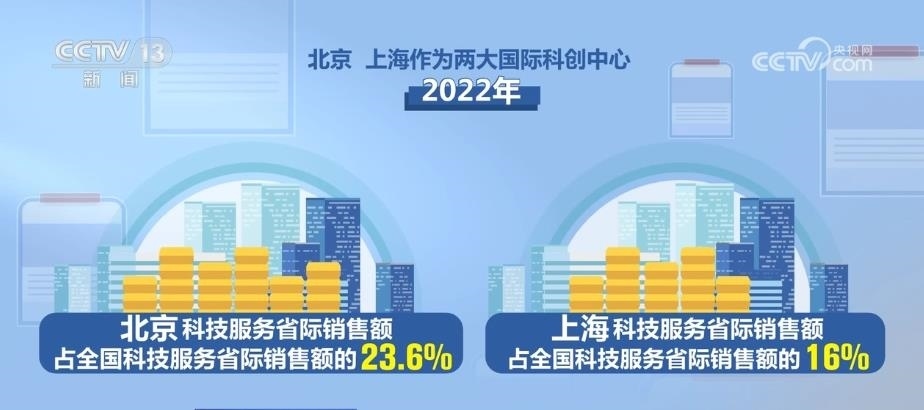 從創(chuàng)新來看,2017年—2022年,全國科技服務(wù)省際銷售額年均增長28%,較科技服務(wù)總體銷售收入增速快4.2個百分點。今年截至5月20日,科技服務(wù)省際銷售額同比增長29.7%,較科技服務(wù)總體銷售收入增速快2.6個百分點。北京、上海作為兩大國際科創(chuàng)中心,2022年科技服務(wù)省際銷售額分別占全國科技服務(wù)省際銷售額的23.6%和16%;2017年—2022年年均分別增長22.1%和24.2%。
