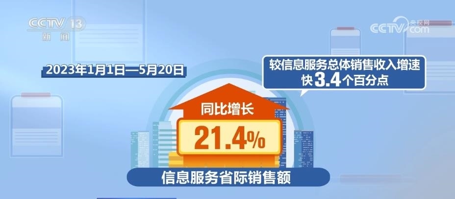 從信息方面來看,2017年—2022年,全國信息服務(wù)省際銷售額年均增長22%,較信息服務(wù)總體銷售收入增速快2.8個百分點。2023年1月1日—5月20日,信息服務(wù)省際銷售額同比增長21.4%,較信息服務(wù)總體銷售收入增速快3.4個百分點。