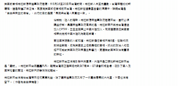 這兩天,譚主發(fā)現(xiàn)臺灣中時新聞網刊發(fā)了一篇快評文章:《特拉斯悄悄走了》。文章說到:特拉斯來臺沒有給臺灣帶來任何實質利益,除了讓民進黨當局又做了一次毫無意義的大內宣,什么也沒有留下。