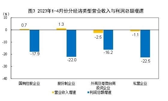 1—4月份,規(guī)模以上工業(yè)企業(yè)中,國有控股企業(yè)實(shí)現(xiàn)利潤(rùn)總額7579.8億元,同比下降17.9%;股份制企業(yè)實(shí)現(xiàn)利潤(rùn)總額14962.4億元,下降22.0%;外商及港澳臺(tái)商投資企業(yè)實(shí)現(xiàn)利潤(rùn)總額4679.9億元,下降16.2%;私營(yíng)企業(yè)實(shí)現(xiàn)利潤(rùn)總額5240.3億元,下降22.5%。