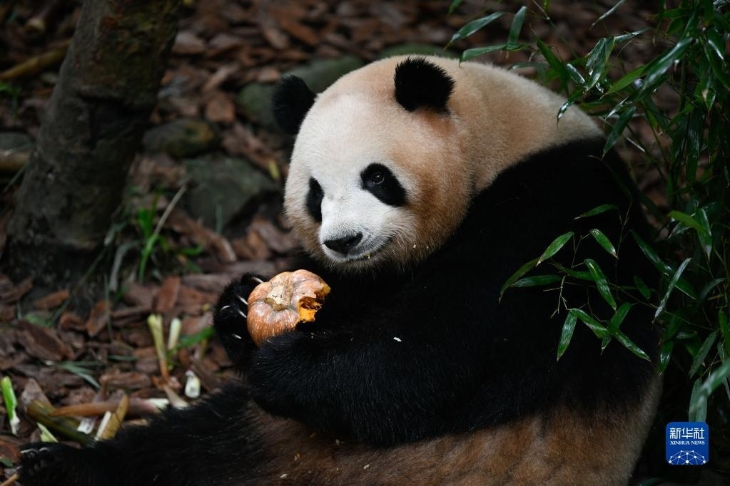 5月29日,在成都大熊貓繁育研究基地都江堰野放繁育研究中心,梅蘭在吃南瓜。