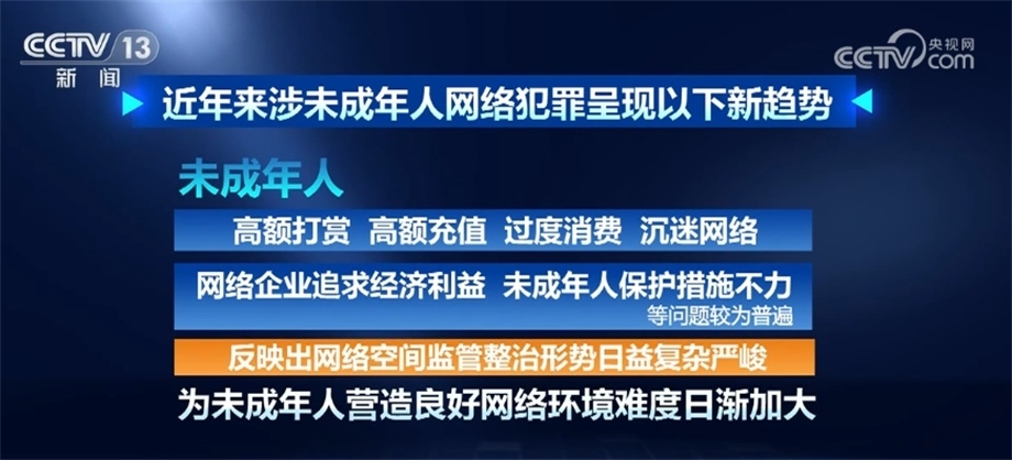 據(jù)最高檢相關(guān)部門負(fù)責(zé)人介紹,近年來涉未成年人網(wǎng)絡(luò)犯罪呈現(xiàn)以下新趨勢:未成年人觸網(wǎng)低齡化日趨明顯,更易遭受網(wǎng)絡(luò)不法侵害;利用網(wǎng)絡(luò)侵害未成年人犯罪手段復(fù)雜多樣,方式不斷翻新,“網(wǎng)絡(luò)誘騙”“隔空猥褻”等新類型犯罪隱蔽性強(qiáng)、打擊難度大;一些未成年人通過網(wǎng)絡(luò)接觸暴力、色情、毒品、低俗等不良信息,導(dǎo)致形成不健康價值觀,甚至盲目跟風(fēng)、走向違法犯罪;未成年人高額打賞、高額充值、過度消費(fèi)、沉迷網(wǎng)絡(luò),網(wǎng)絡(luò)企業(yè)追求經(jīng)濟(jì)利益、未成年人保護(hù)措施不力等問題較為普遍,反映出網(wǎng)絡(luò)空間監(jiān)管整治形勢日益復(fù)雜嚴(yán)峻,為未成年人營造良好網(wǎng)絡(luò)環(huán)境難度日漸加大。