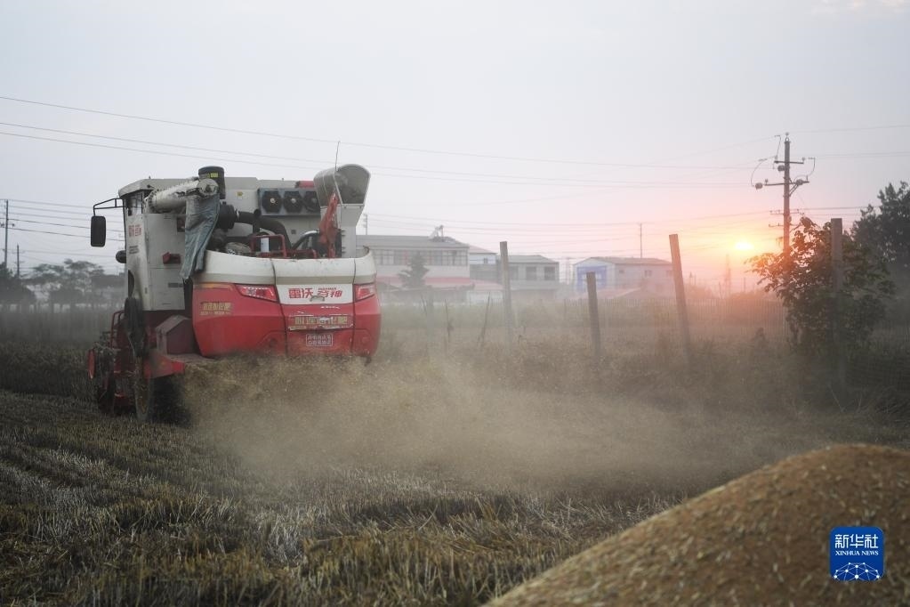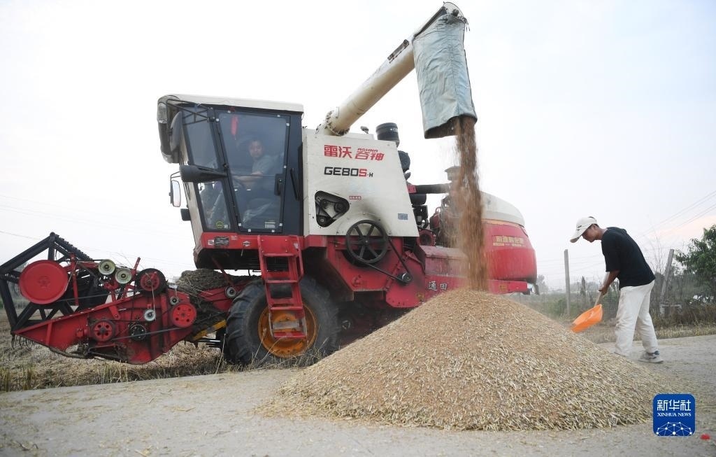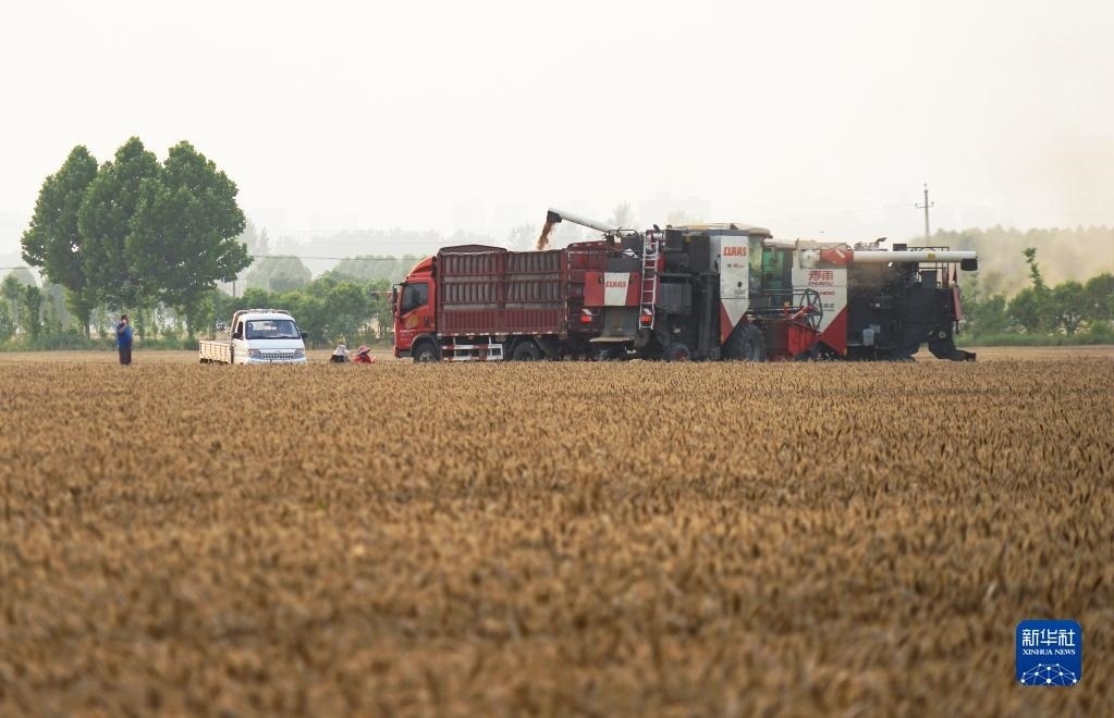 6月1日,在河南省駐馬店市上蔡縣邵店鎮(zhèn)劉岳村,收割機(jī)在搶收小麥。新華社記者 張浩然 攝