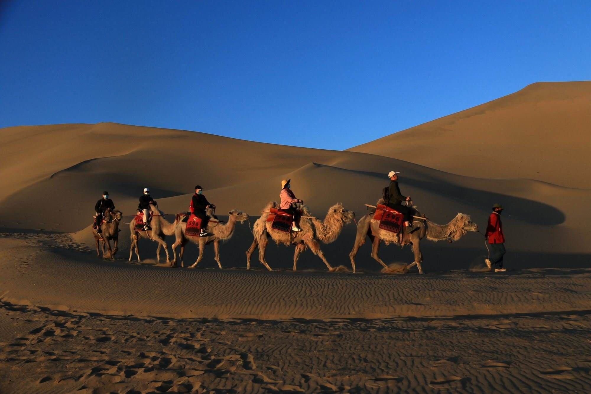 甘肅敦煌:游客騎駱駝游覽鳴沙山