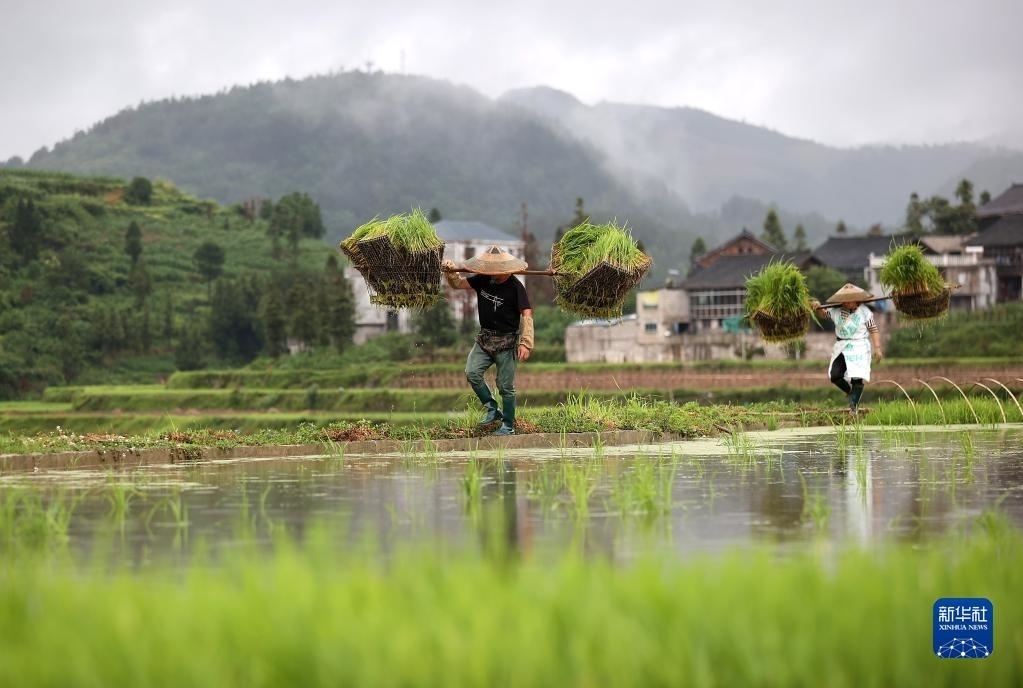 6月5日,貴州省黔東南苗族侗族自治州丹寨縣揚(yáng)武鎮(zhèn)長青社區(qū)村民在田間挑運(yùn)水稻秧苗。
