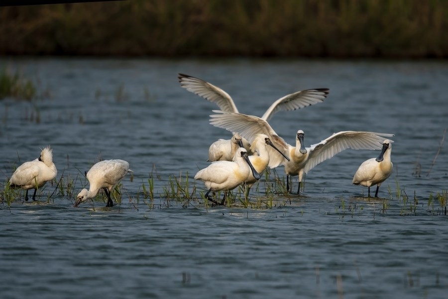 4月8日,黑臉琵鷺在福建省閩江河口濕地停歇。新華社記者 梅永存 攝