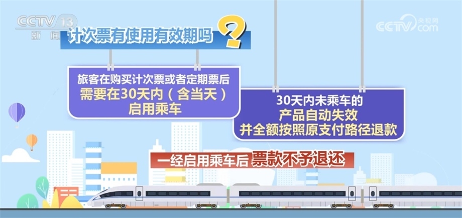 旅客在購買計次票或者定期票后,需要在30天內(nèi)(含當天)啟用乘車,30天內(nèi)未乘車的,產(chǎn)品自動失效并全額按照原支付路徑退款。一經(jīng)啟用乘車后,票款不予退還。