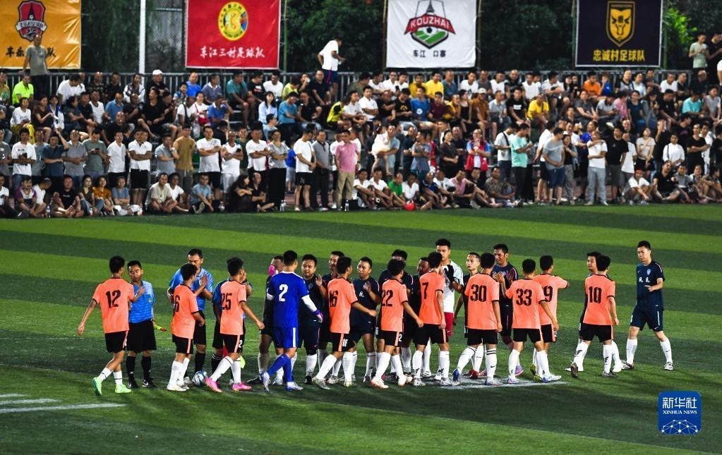 6月9日,鳳凰村足球隊(duì)與新中村足球隊(duì)在比賽結(jié)束后相互擊掌致意。   新華社記者 楊文斌 攝