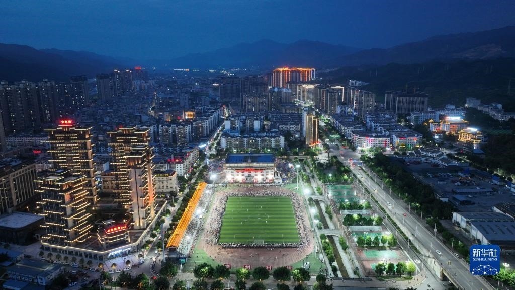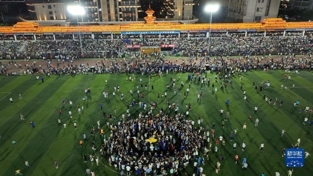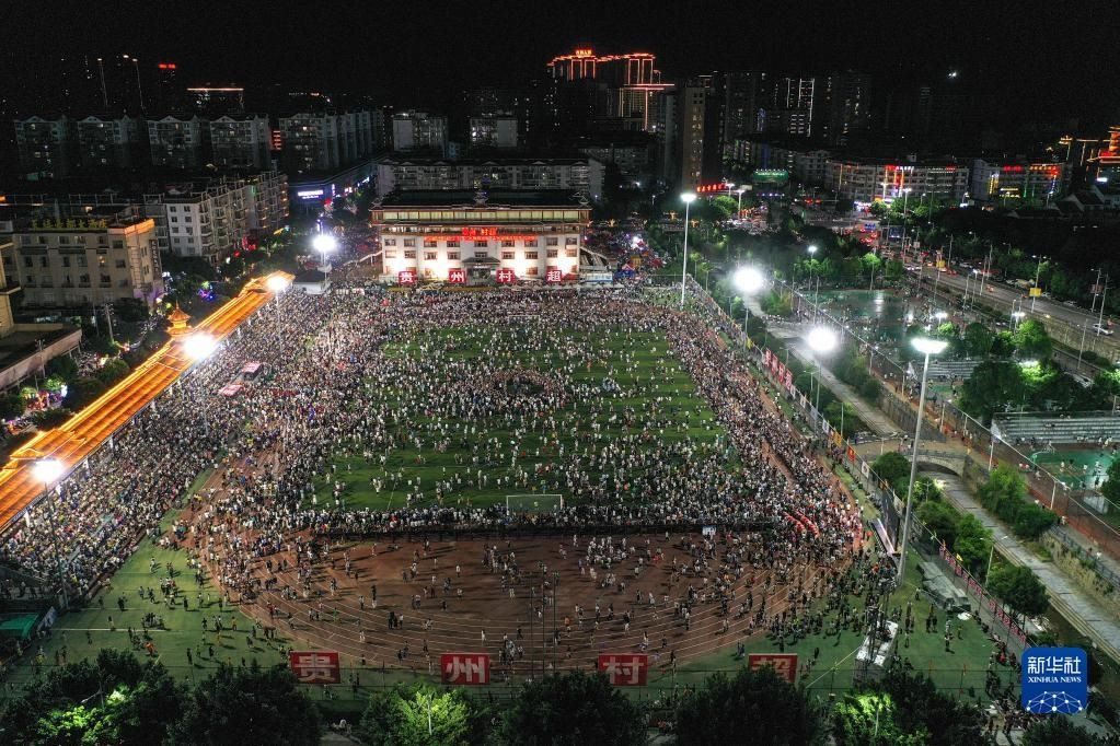 6月10日,演員在貴州“村超”足球比賽后表演民族舞蹈“多耶”,現(xiàn)場觀眾一起上場狂歡(無人機(jī)照片)。   新華社記者 楊文斌 攝