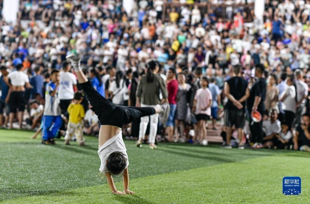 6月9日,小朋友在貴州“村超”足球比賽半場休息時間展示體操。   新華社記者 楊文斌 攝