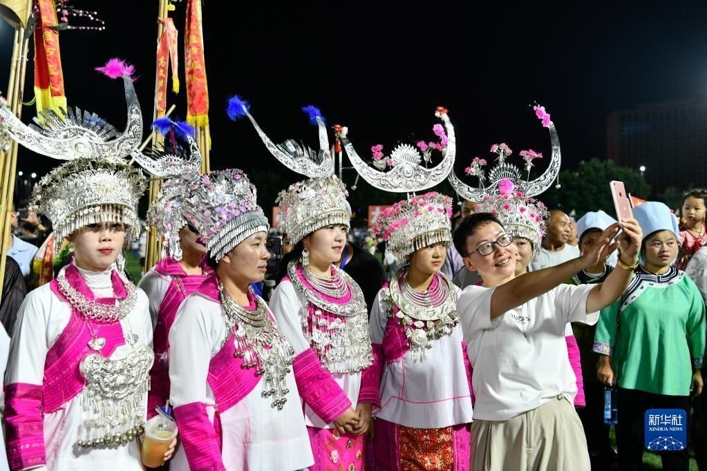 6月9日,一名游客在貴州“村超”足球比賽現(xiàn)場與少數(shù)民族拉拉隊(duì)合影。   新華社記者 楊文斌 攝
