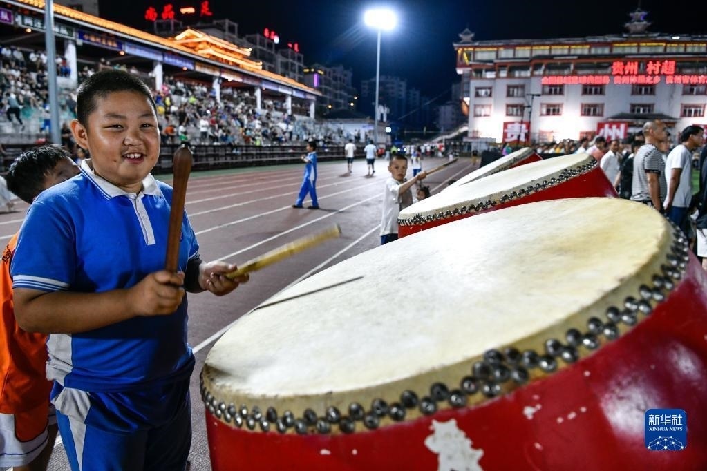 6月9日,一名小朋友在貴州“村超”足球比賽現(xiàn)場擊鼓助威。   新華社記者 楊文斌 攝