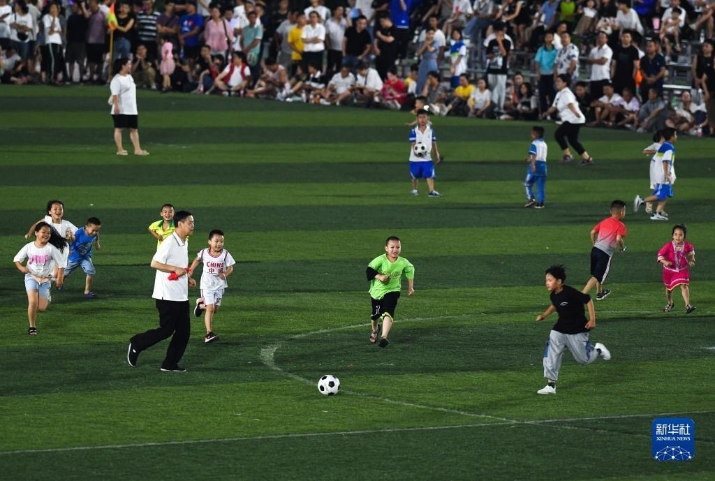 6月9日,小朋友們在貴州“村超”足球比賽半場休息時間上場踢球。   新華社記者 楊文斌 攝