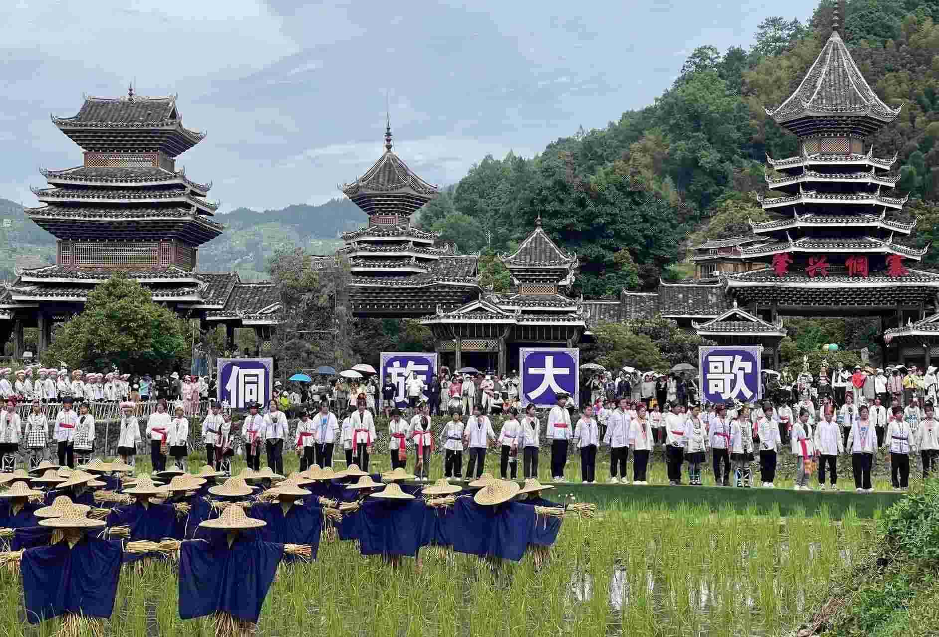 2023年6月10日,侗族同胞在貴州省黎平縣肇興侗寨田園實景展示侗族大歌。